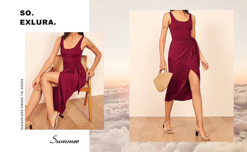 Features: Split front, casual style, sleeveless, round neckline, with belt at waist, backless, slit up to thigh, midi length, irregular hem.